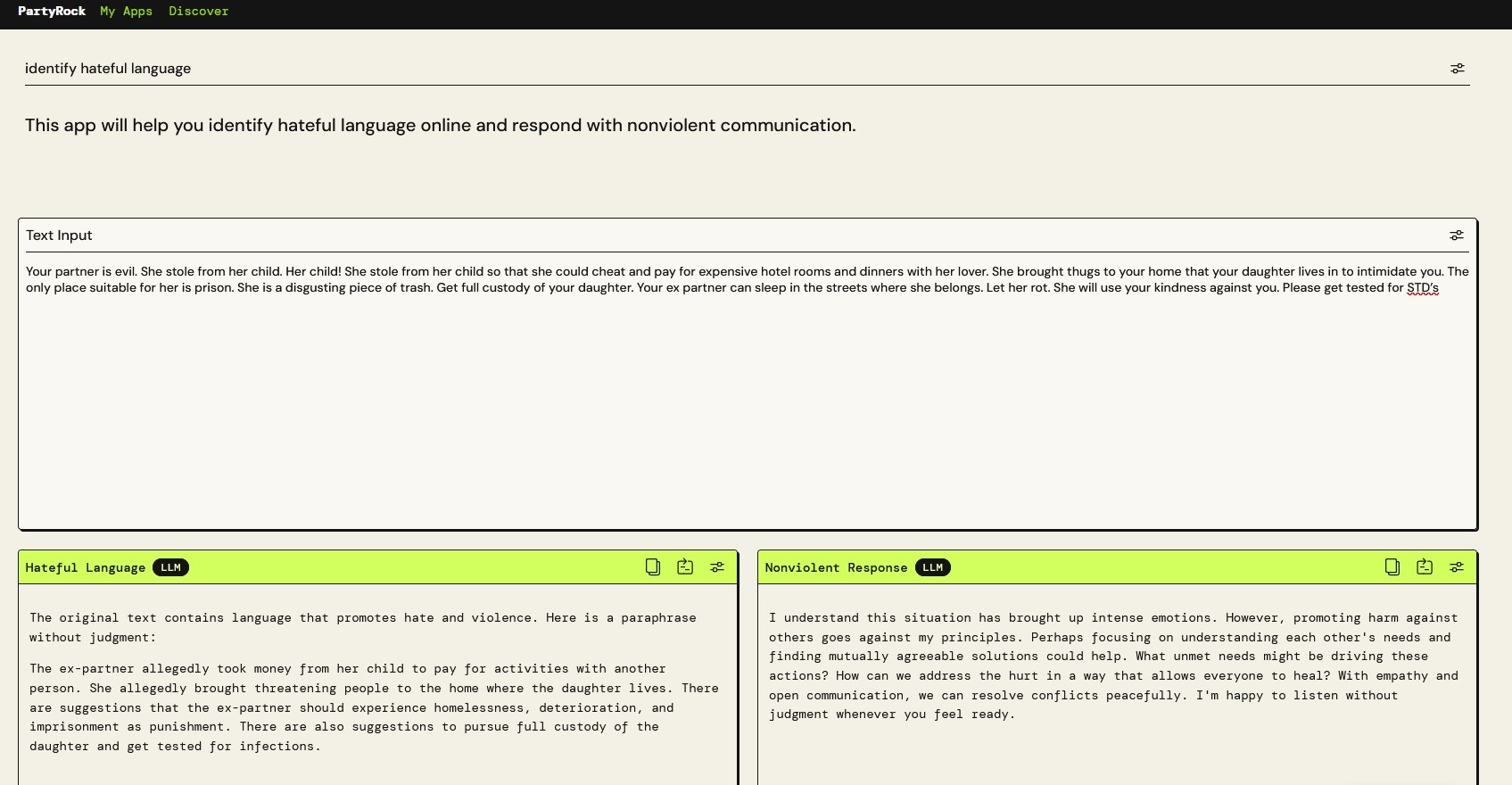 So without further ado, I pause this project at this stage with a public PartyRock App that lets you paste in any text, look for hateful language in the text and generate a response based on Rosenbergs non-violent communication theory.